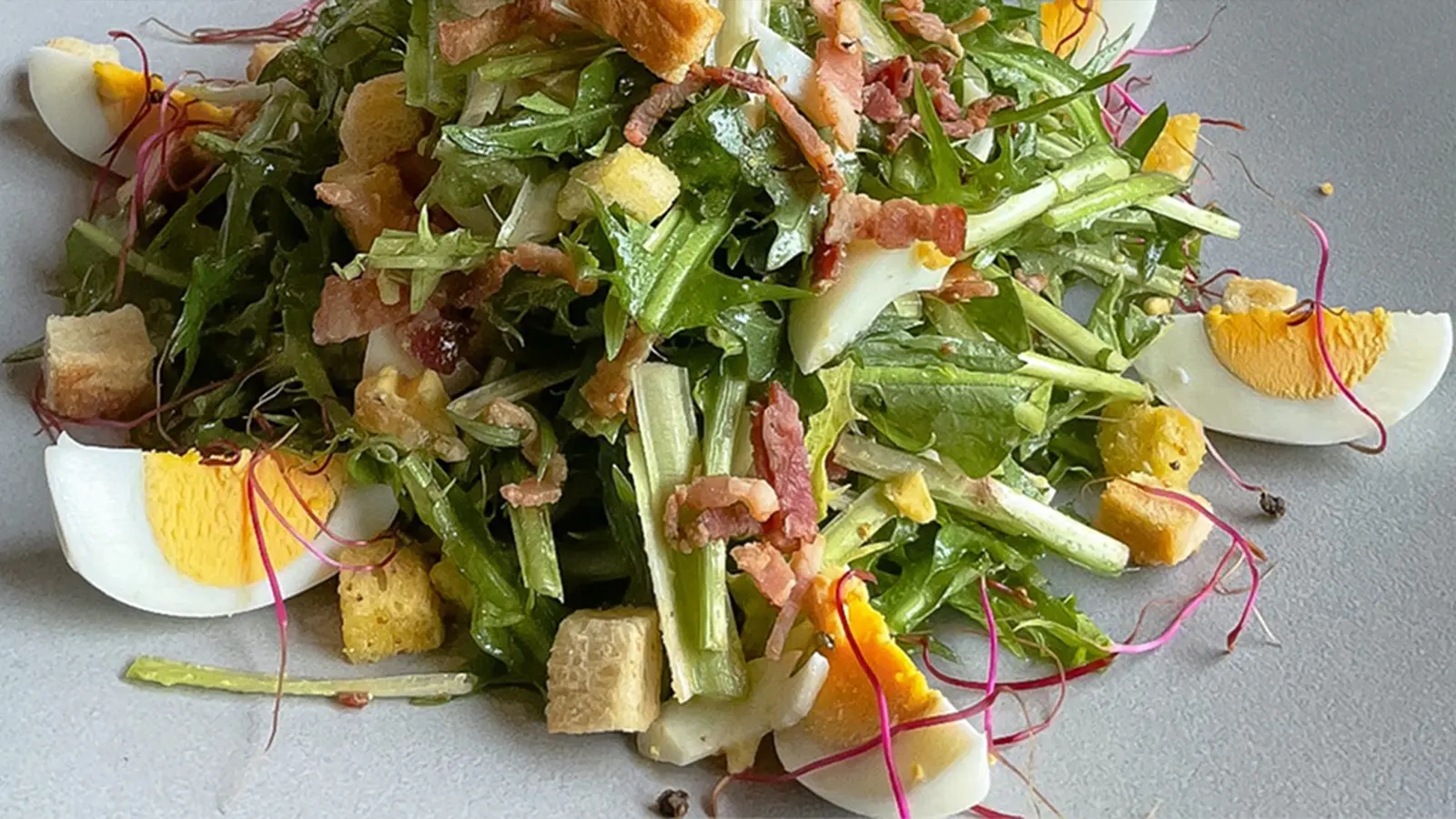 Iceberg salad with poached egg, bacon and flavored truffle croutons