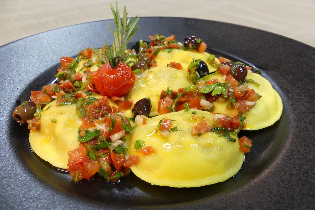 Tortelloni with burrata and tomatoes, rocket salad sauce